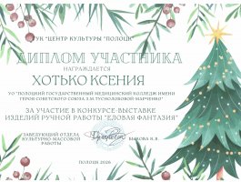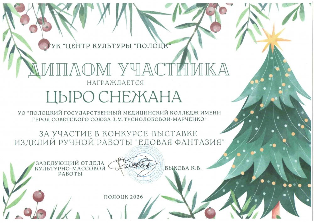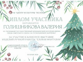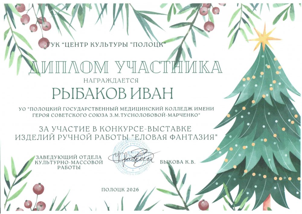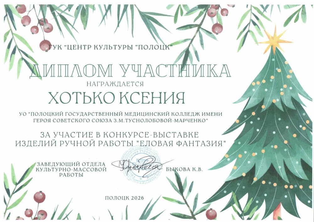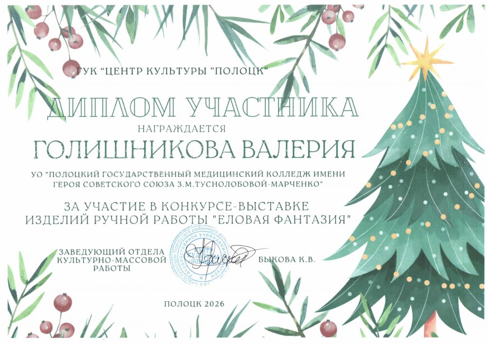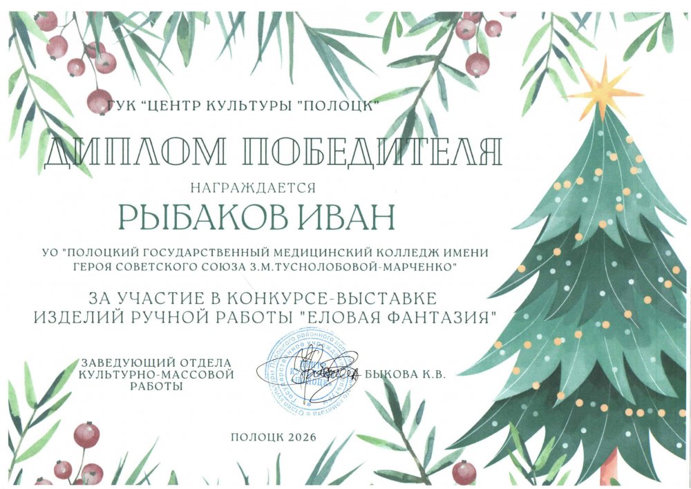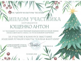 С 19 по 27 января 2026 года в ГУК «Центр культуры «Полоцк»» состоялась районная выставка изделий ручной работы «Еловая фантазия», в которой учащиеся колледжа приняли активное участие, представив на выставке ёлки, изготовленные из разных материалов.
