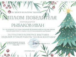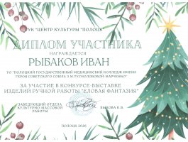 Организаторы выставки единогласно присудили Диплом победителя Рыбакову Ивану (гр. СД-1-1) за его оригинальную и необычную работу «Символ праздника»! Сертификаты участника выставки «Еловая фантазия» вручены Голишниковой Валерии (гр.4ЛД) - «Праздник к нам приходит», Хотько Ксении (гр.2ЛД) - «Ёлкина зимовка», Ющенко Антону (гр.СД-2-2) - «Праздника нарядная подруга», Цыро Снежане (гр.СД-3) - «Макаронная Ёлка».