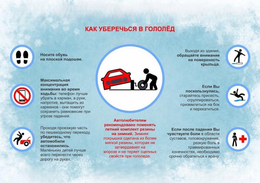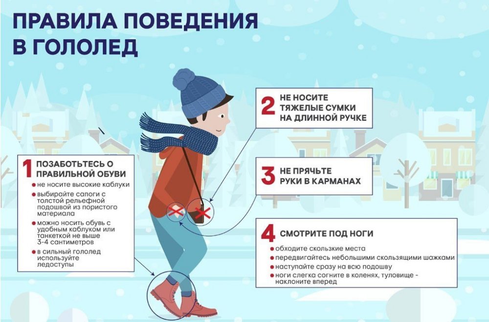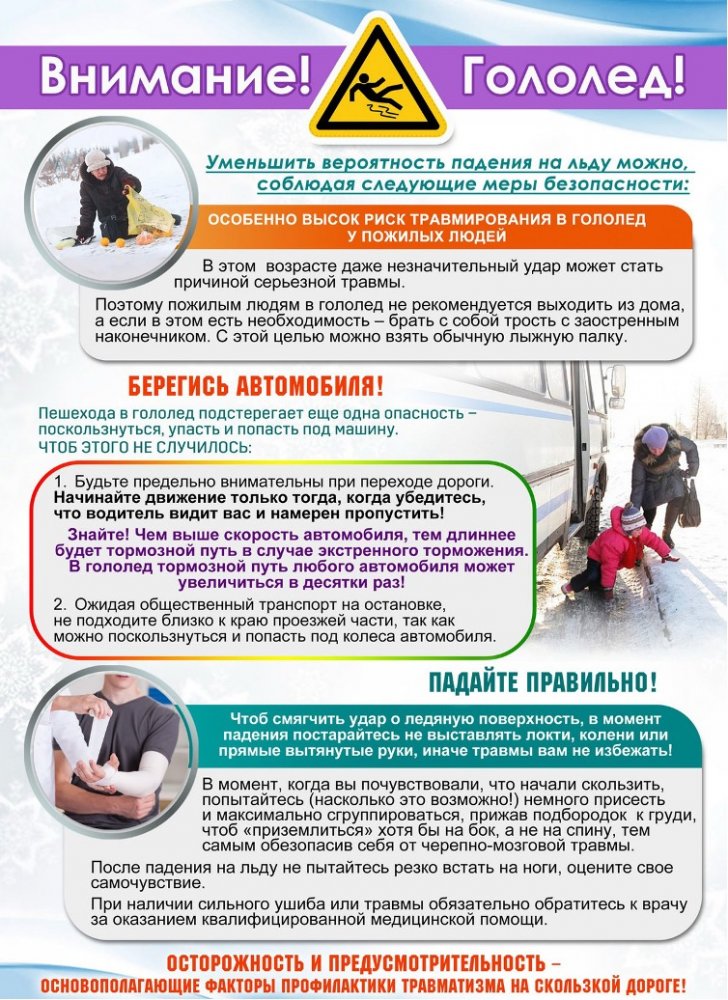 В связи с неустойчивостью погоды, способствующей образованию гололёда и в дальнейшем при ухудшении погодных условий в виде осадков снега и возросшей скользкости на дорогах, тротуарах, подъездных путях, повышается риск травматизма.