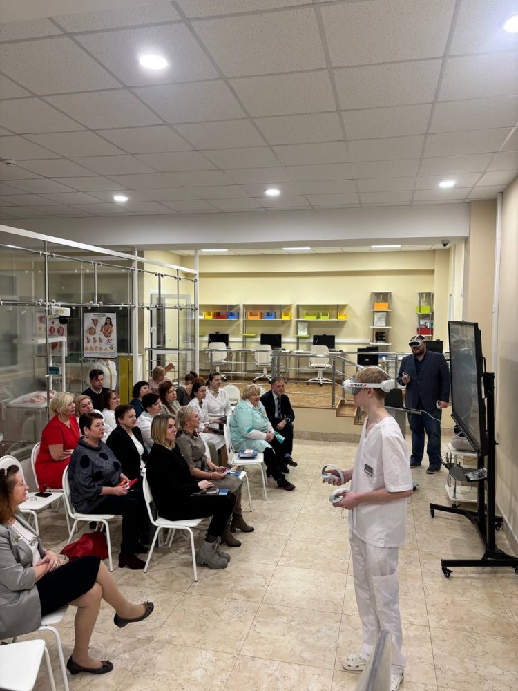 Представитель ООО «Медвиар» Флоренский Е. А. провёл занятие для педагогических работников и студентов на высокореалистичных симуляторах медицинской клиники, палат ОРИТ с командным взаимодействием, неотложной медицинской помощи, сестринского дела, реализуемых с помощью технологий виртуальной реальности XR (расширенная реальность), которая позволяет погрузить человека в виртуальное окружение. В конце занятия участники семинара поделились своими впечатлениями, и отметили, что использование данной технологии в образовательном процессе является безусловно перспективным. Высокореалистичное моделирование по наиболее распространённым или сложным клиническим случаям помогает обучающимся повысить уровень подготовки и уверенности в своих действиях. После семинара директор Великолукского колледжа Шулаев Александр Анатольевич познакомил наших преподавателей с колледжем и достопримечательностями города.