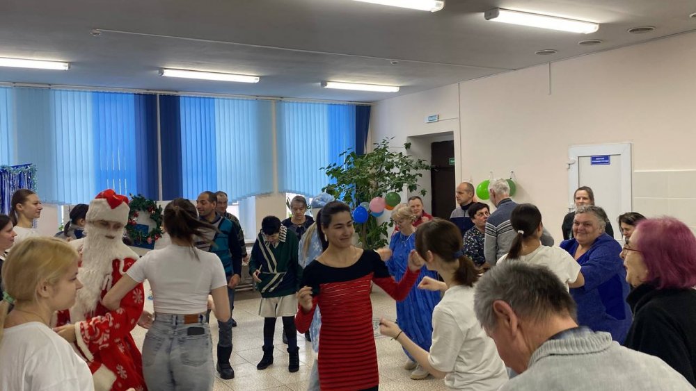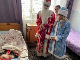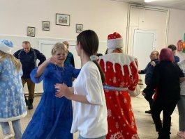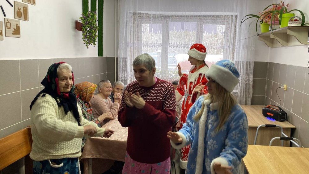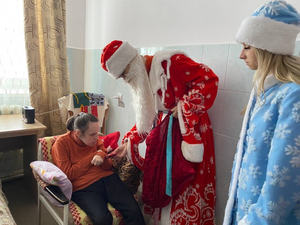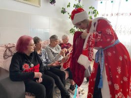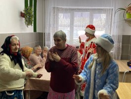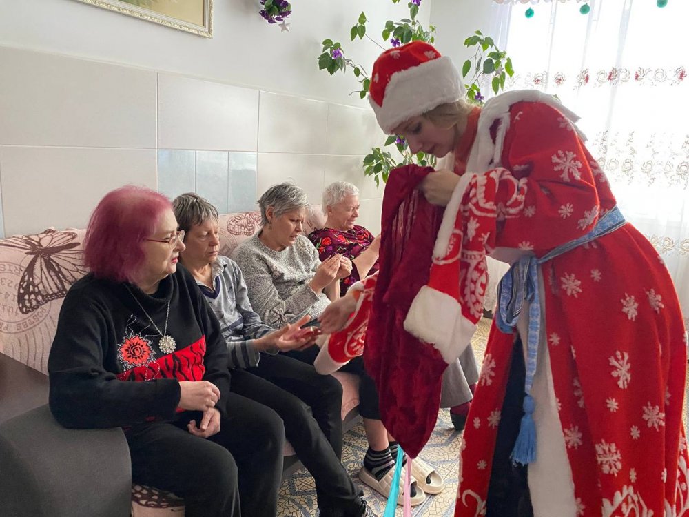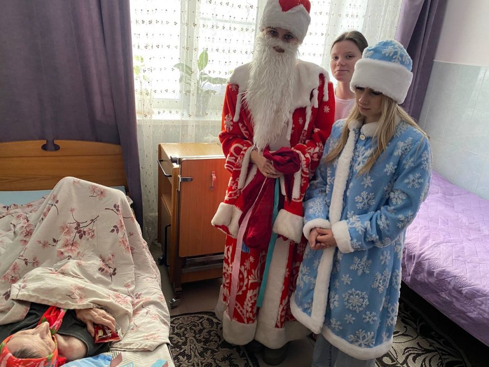 Дед Мороз и Снегурочка поздравляли каждого присутствующего сладкими подарками. Атмосфера была наполнена улыбками, аплодисментами и взаимной благодарностью. Понимая, что не все жители пансионата могут прийти в зал, сказочные гости отправились в палаты. Они лично поздравили каждого, кто не смог выйти, подарив им немного личного внимания, тёплых слов и сладкие гостинцы. Для этих людей тёплая улыбка и персональное поздравление с вручением сладкого гостинца стали самым настоящим праздником.