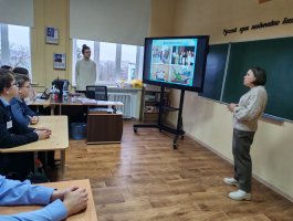Преподаватель колледжа Топырик А.Г. рассказала школьникам об истории колледжа, о специальностях подготовки: «Сестринское дело», «Лечебное дело» и сроках обучения, условиях поступления и проходных баллах 2025 года, о возможности целевой подготовки и распределения по месту проживания.