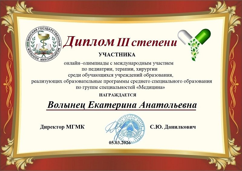 05.03.2026 года была проведена онлайн-олимпиада с международным участием по педиатрии, терапии, хирургии среди обучающихся учреждений образования, реализующих образовательные программы среднего специального образования по группе специальностей «Медицина». Олимпиада проводилась учреждением образования «Минский государственный медицинский колледж» в режиме онлайн на платформе GOOGLE. Велась видео- и аудио- запись выполнения заданий олимпиады участниками, материалы которой были переданы в оргкомитет онлайн-олимпиады.
