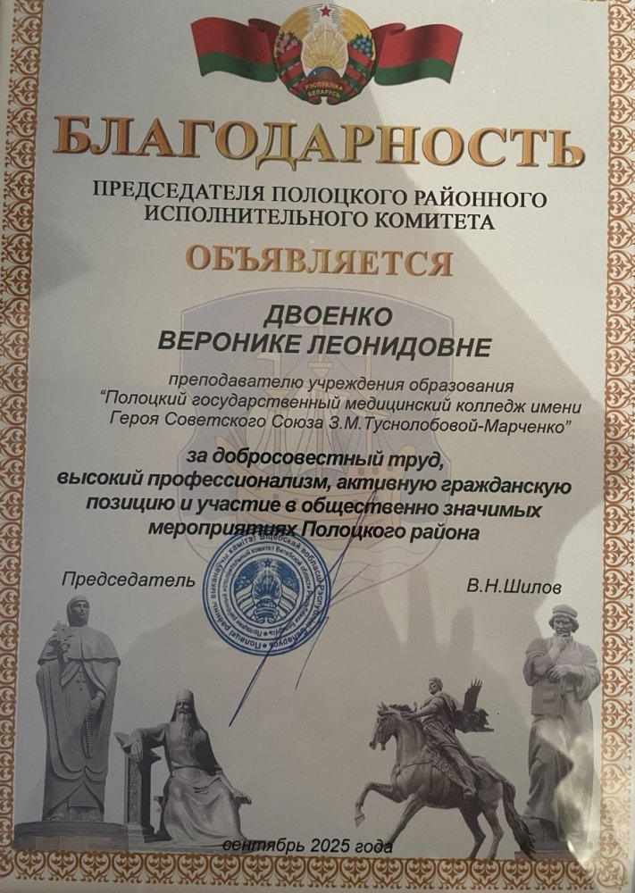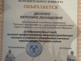 Во время концерта состоялось награждение Благодарностями Полоцкого райисполкома, как сказал председатель райисполкома Василий Николаевич Шилов, «лучших из лучших полочан». Всем нам очень приятно, что такой наградой отмечен преподаватель, председатель профкома работников нашего колледжа Двоенко Вероника Леонидовна. Поздравляем Веронику Леонидовну с заслуженной наградой! Поздравляем всех с днём народного единства!