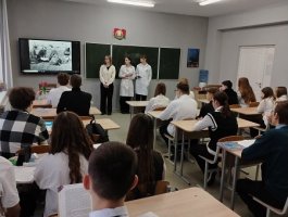 Ответственный секретарь приёмной комиссии колледжа Колбина С.Н. рассказала школьникам об истории колледжа, о специальностях подготовки: «Сестринское дело», «Лечебное дело» и сроках обучения, условиях поступления и проходных балах 2025 года, о перспективах профессионального развития для медицинских работников среднего звена и возможности целевой подготовки и распределения по месту проживания.