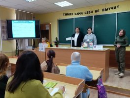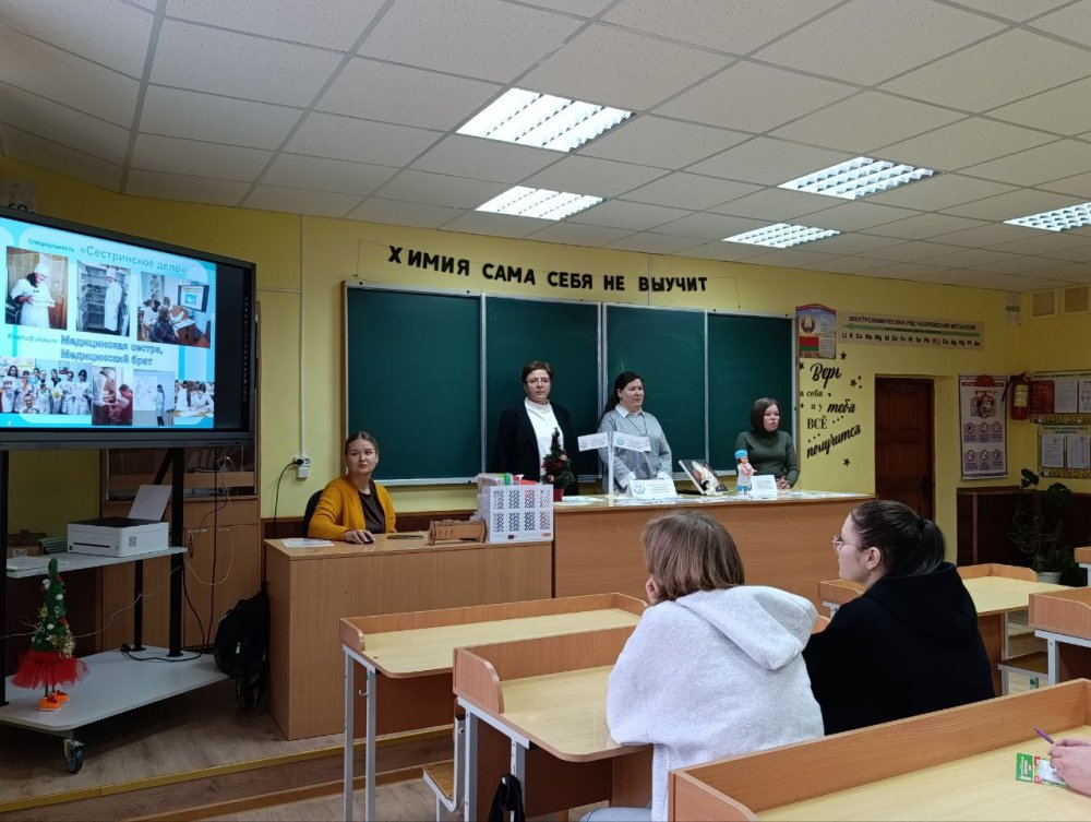 Анна Георгиевна подробно рассказала о колледже, специальностях подготовки и организации обучения в колледже, о поступлении в колледж на условиях целевой подготовки и проходных баллах в 2025 году. Валерия поделилась со школьниками информацией о том, как состоялся её выбор профессии, как проходит учёба в колледже и организован досуг, а также своими впечатлениями о прохождении учебной практики на базе организаций здравоохранения.