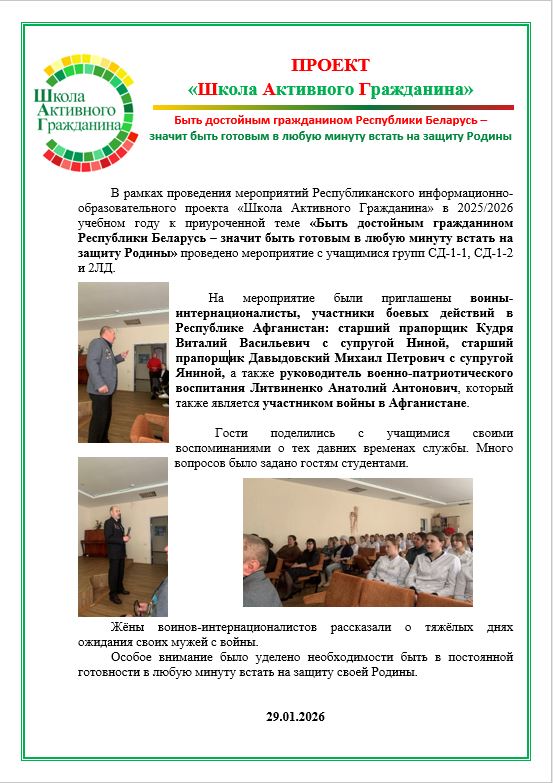 «Быть достойным гражданином Республики Беларусь – значит в любую минуту быть готовым защитить её» (Мир как безусловная ценность и необходимое условие жизни, благополучия и развития. Вооруженные Силы Республики Беларусь. Система военного образования в Республике Беларусь. Военно патриотические клубы учащихся). |