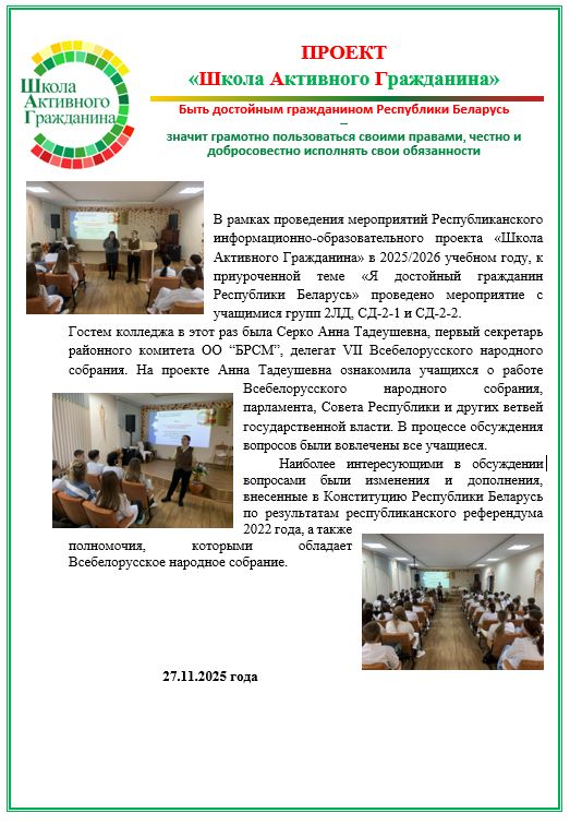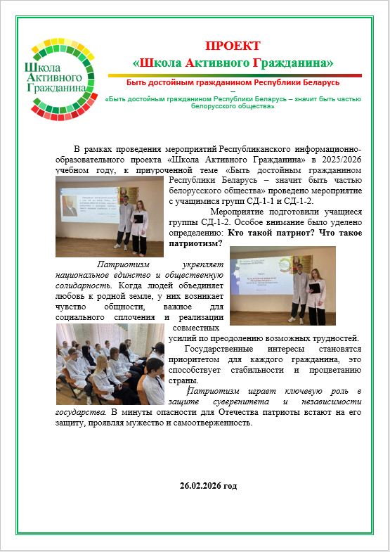 Проект «ШАГ» («Школа Активного Гражданина») в 2025–2026 учебном году продолжает оставаться важной частью воспитательной и идеологической работы в школах Беларуси. Его главная цель — формирование у обучащихся 1-2 курсов активной гражданской позиции, знаний о государстве и обществе, а также развитие личных качеств, необходимых для достойного гражданина Республики Беларусь