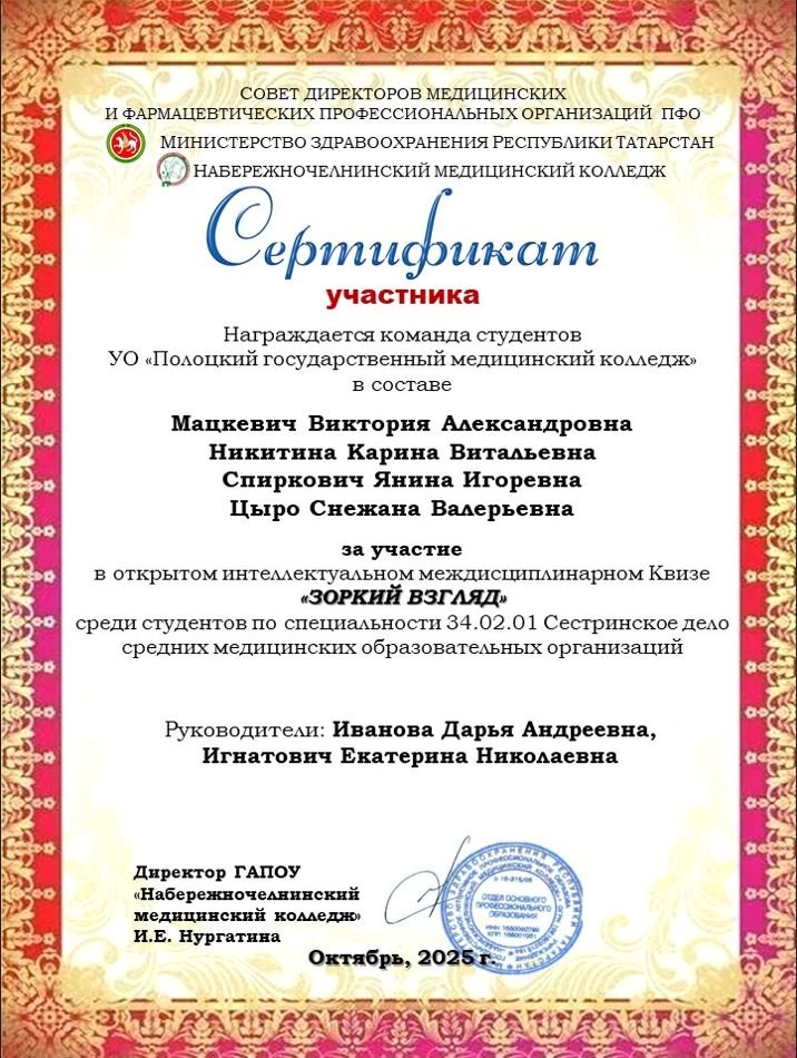 09.10.2025 г. команда учащихся группы СД-3 Полоцкого медицинского колледжа в составе: Мацкевич Виктории, Никитиной Карины, Спиркович Янины и Цыро Снежаны под руководством преподавателей Шевченко Елены Ивановны, Игнатович Екатерины Николаевны и Ивановой Дарьи Андреевны приняла участие в интеллектуальном междисциплинарном квизе «Зоркий взгляд».