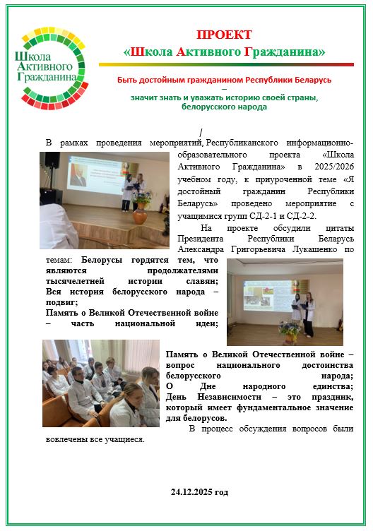 Проект «ШАГ» («Школа Активного Гражданина») в 2025–2026 учебном году продолжает оставаться важной частью воспитательной и идеологической работы в школах Беларуси. Его главная цель — формирование у обучащихся 1-2 курсов активной гражданской позиции, знаний о государстве и обществе, а также развитие личных качеств, необходимых для достойного гражданина Республики Беларусь