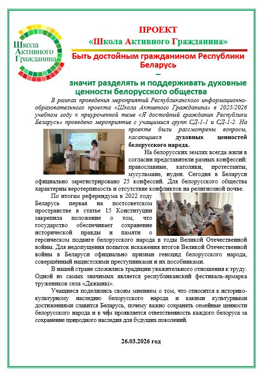 «Быть достойным гражданином Республики Беларусь – значит разделять и поддерживать духовные ценности белорусского общества» (Духовность и культура белорусского народа. Национальное искусство и творчество. Знания и образование. Важность сохранения исторической памяти. Семейные ценности белорусов. Экологическая и социальная ответственность). |
