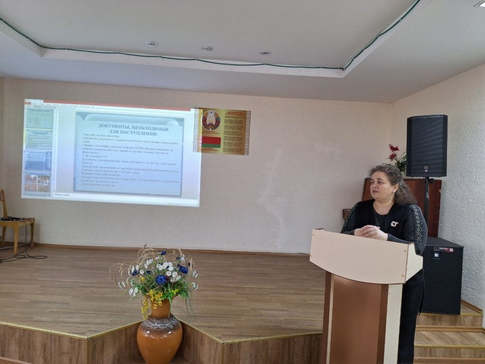 Перед учащимися выступила директор колледжа И.Н.Шевякова с информацией об истории колледжа, организации образовательного процесса, специальностях подготовки в колледже, об условиях набора по целевой подготовке. Колледж посетили учащиеся 9-х -11-х классов средних школ №№ 2, 8, 10, 14, 16, гимназии №№ 1, 2 г.Полоцка, Ветринской средней школы Полоцкого района, средних школ №№ 1, 3, 5, 7, 10 г.Новополоцка, гимназии № 5 г. Витебска, а также учащиеся Миорского района в сопровождении законных представителей и учителей.
