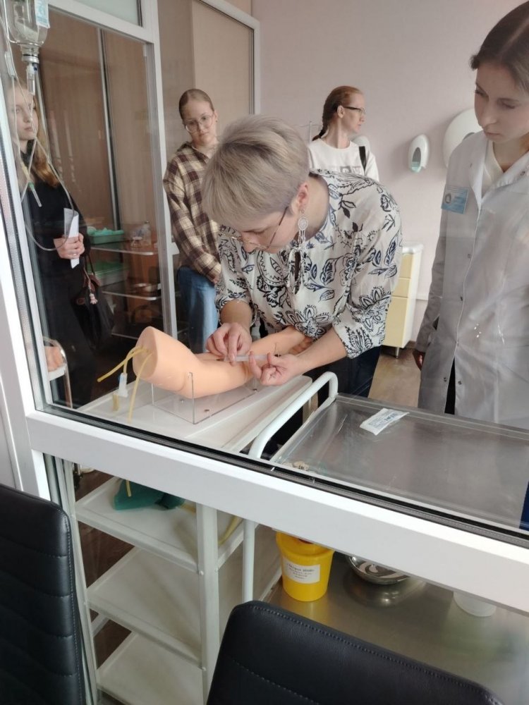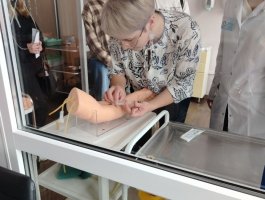 Информацию о приёмной кампании 2025 года, правилах поступления и планируемом наборе в текущем году гостям представила ответственный секретарь приёмной комиссии Д.А. Иванова. Все школьники, в составе малых групп, смогли попробовать выполнить наиболее значимые манипуляции по уходу за пациентами разного возраста, в том числе базовую сердечно-лёгочную реанимацию, под руководством учащихся выпускных групп колледжа групп 3СД и 4ЛД на базе модулей лаборатории по отработке навыков.
