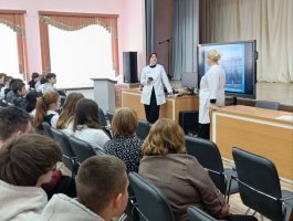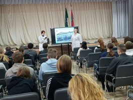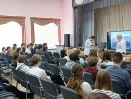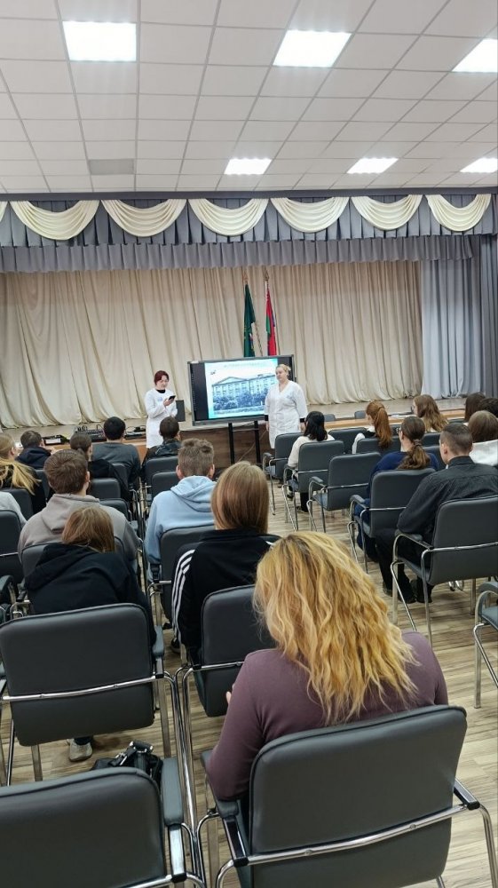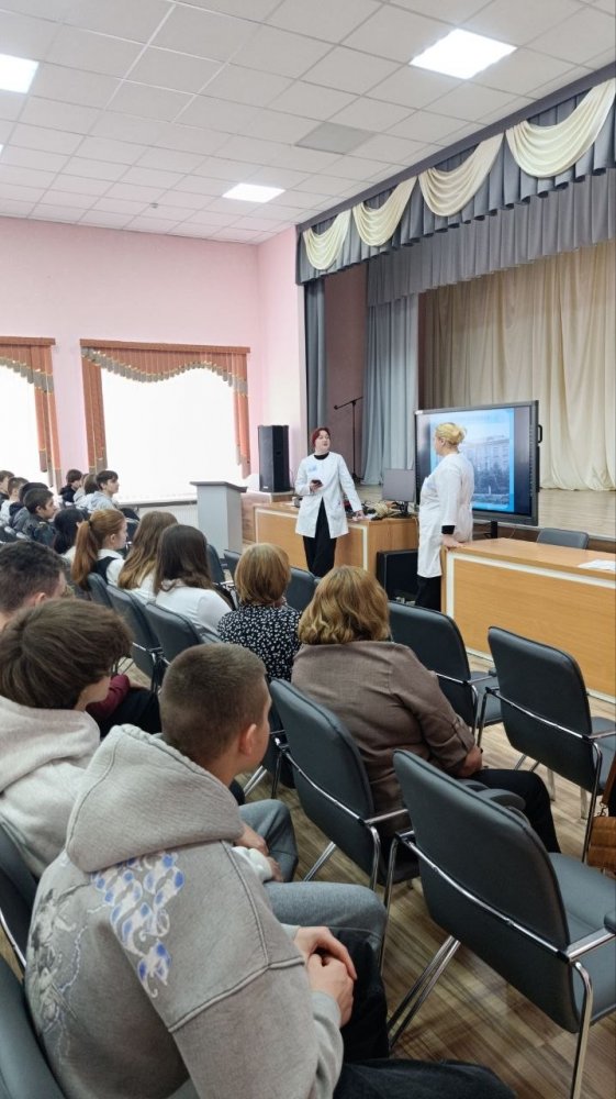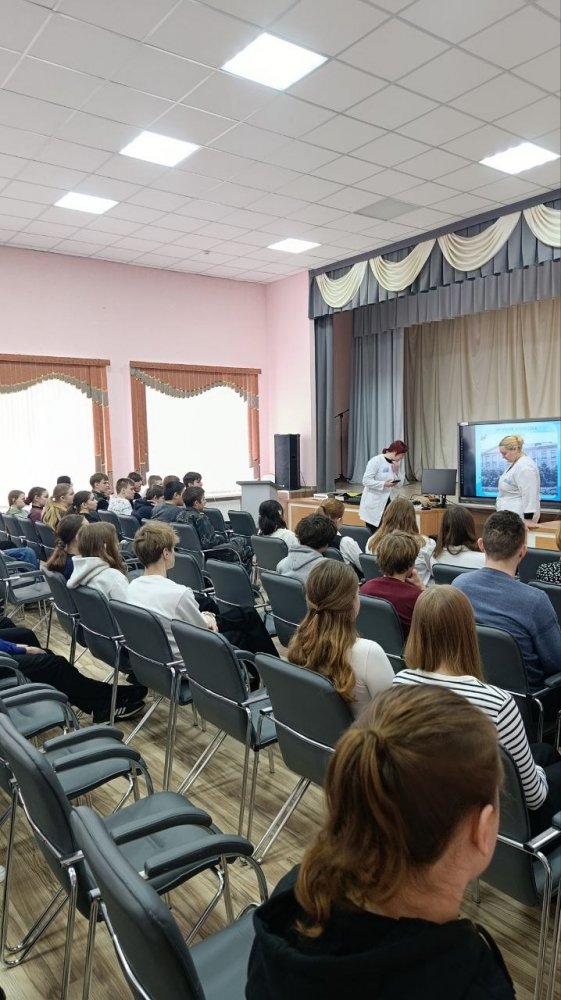 Колледж представляли учащиеся выпускной группы 3СД Рачицкая Дарья и Устинова Анна, которые рассказали школьникам о важности профессии медицинского работника, об этапах истории колледжа, дали подробную информацию о специальностях подготовки и результатах вступительной кампании 2025 года, об организации обучения в колледже и возможностях целевой подготовки, а также поделились своими впечатлениями об учёбе в колледже.