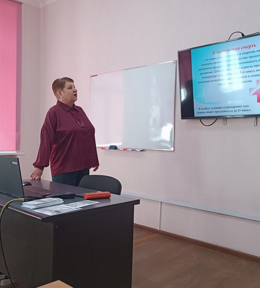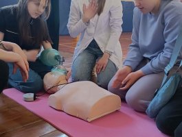Провела занятие преподаватель Астановка Мария Антоновна, которая ознакомила присутствующих с теоретическими основами проведения базовой сердечно-лёгочной реанимации, транспортной иммобилизации конечностей и правилами остановки кровотечений. Далее школьники, под руководством учащихся колледжа и контролем преподавателя, смогли отработать технику оказания первой помощи при вышеперечисленных ситуациях на тренажёрах-симуляторах и на статистах.