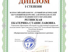 Преподаватели нашего колледжа Козлова Татьяна Сергеевна и Ретинская Екатерина Станиславовна приняли участие в данном конкурсе. Видеоролики по темам «Подкожное введение лекарственного средства», «Внутримышечное введение лекарственного средства» отмечены Дипломами Ⅰ степени.