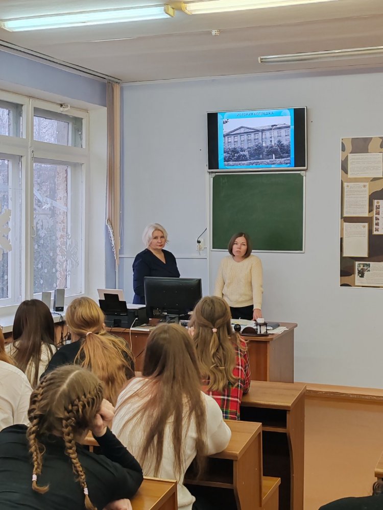 Преподаватель колледжа Топырик А.Г. рассказала школьникам об истории колледжа, о специальностях подготовки: «Сестринское дело», «Лечебное дело» и сроках обучения, условиях поступления и проходных баллах 2025 года, о возможности целевой подготовки и распределения по месту проживания.
